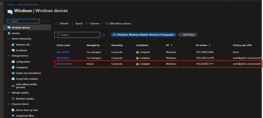 This view displays all enrolled Windows devices in your organization with their current status, compliance posture, and assignment information.