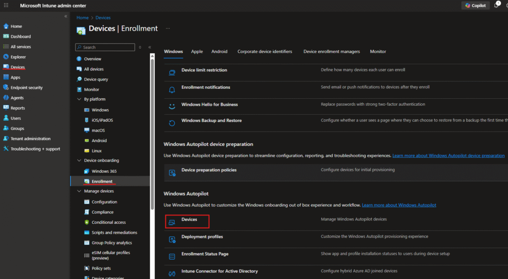 Devices > Enrollment > Windows enrollment > Devices (under Windows Autopilot)
