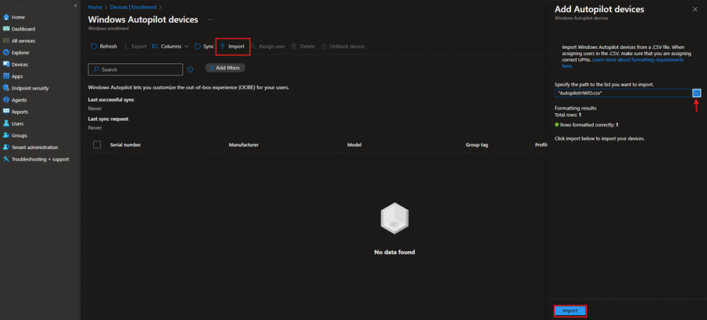 After selecting your file and confirming the formatting validation, click the Import button to complete the process. Intune processes the data and registers devices in the Autopilot service.