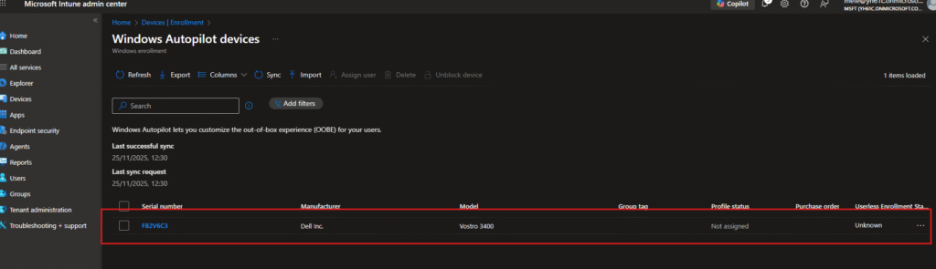 This centralized location manages all aspects of your Autopilot infrastructure. The interface provides an overview of all registered devices, sync history, and enrollment statistics.