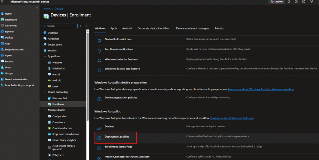 Devices > Enrollment > Windows Autopilot / Deployment profiles