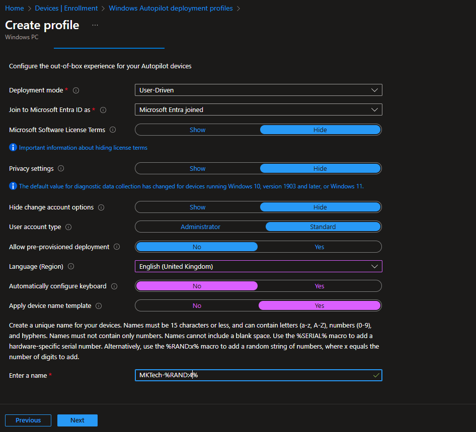 Profile name: Provide a descriptive name reflecting your deployment strategy (e.g., “User Driven Profile,” “Employee Onboarding Profile”). This name appears throughout the admin center for easy identification.