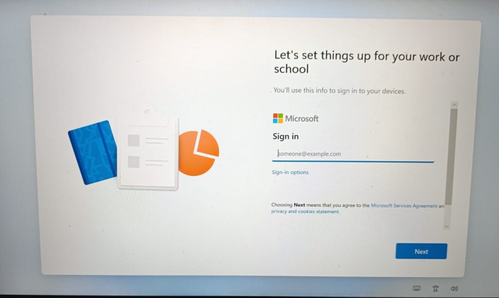 When a user unboxes their new device and powers it on, they encounter the Microsoft sign-in screen. The device displays:
