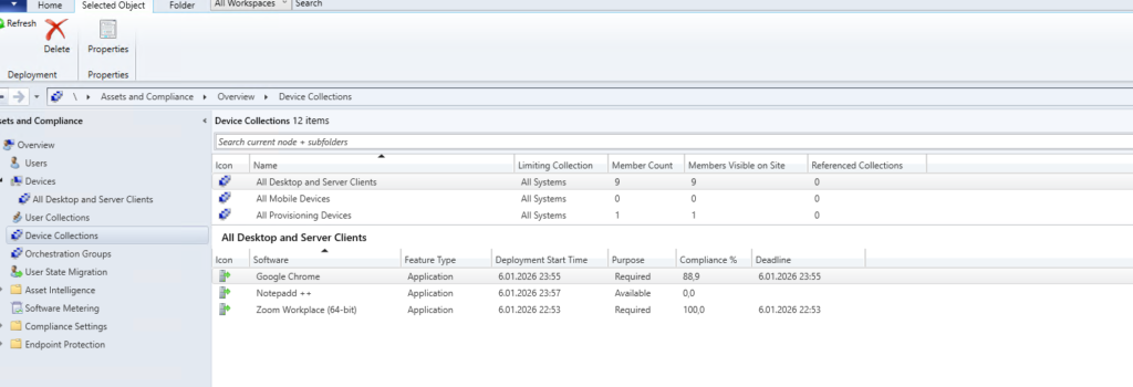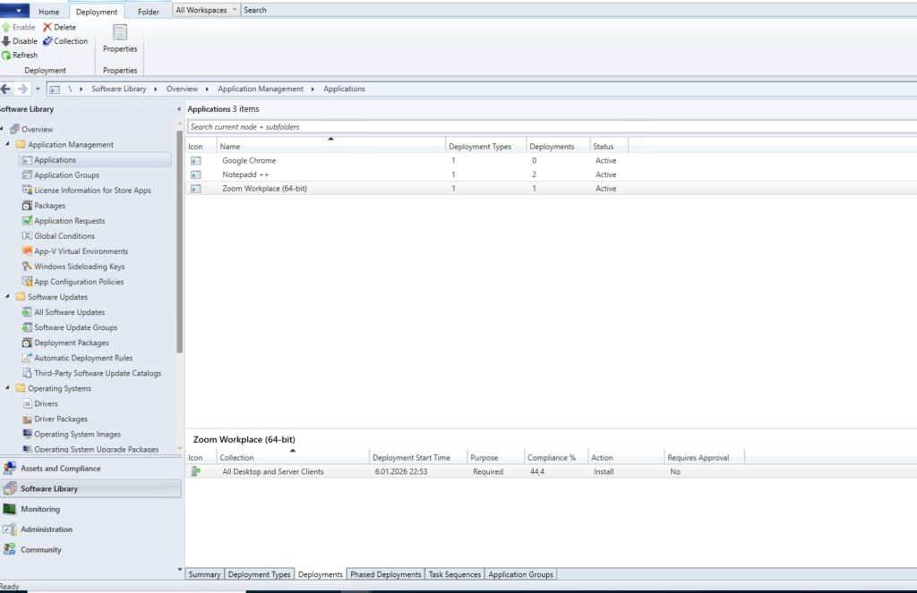 Now let’s verify the requirement exclusion is working correctly by checking the actual devices. In this example, Zoom Workplace is deployed as Required to the “All Desktop and Server Clients” collection, but with an OU-based requirement that excludes certain devices.