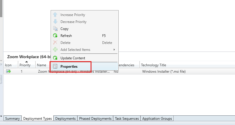 Right-click on the deployment type you want to modify and select Properties: