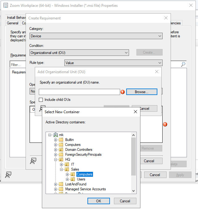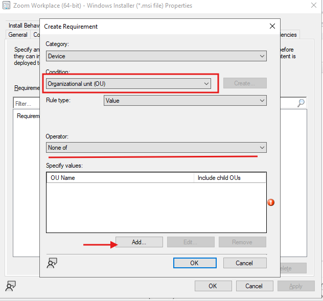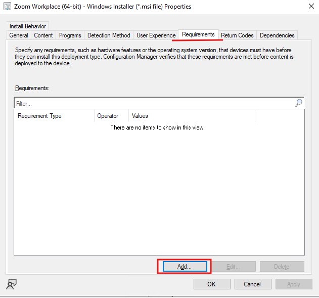 In the Properties window, click on the Requirements tab. This is where you’ll define conditions that devices must meet (or not meet) to receive the deployment.Click the Add button to create a new requirement rule. The “Create Requirement” dialog will open.