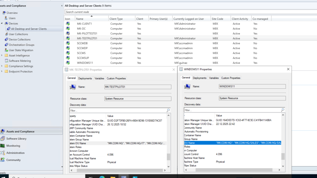Navigate to Assets and Compliance > Devices > All Desktop and Server Clients and examine the properties of different devices. Look at the “System OU Name” property to see which OU each device belongs to.