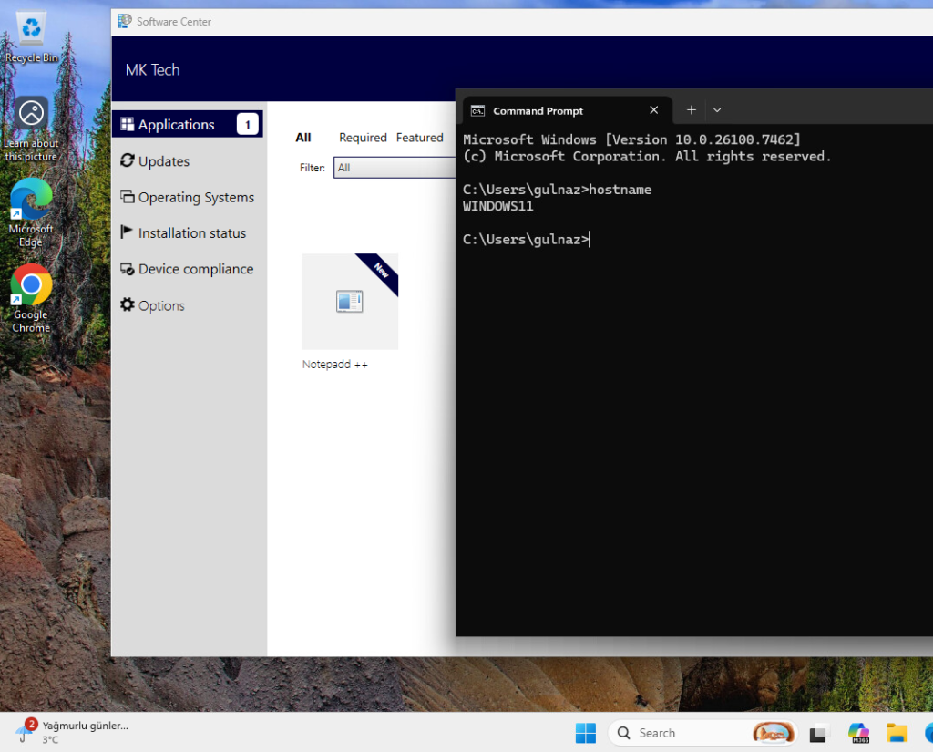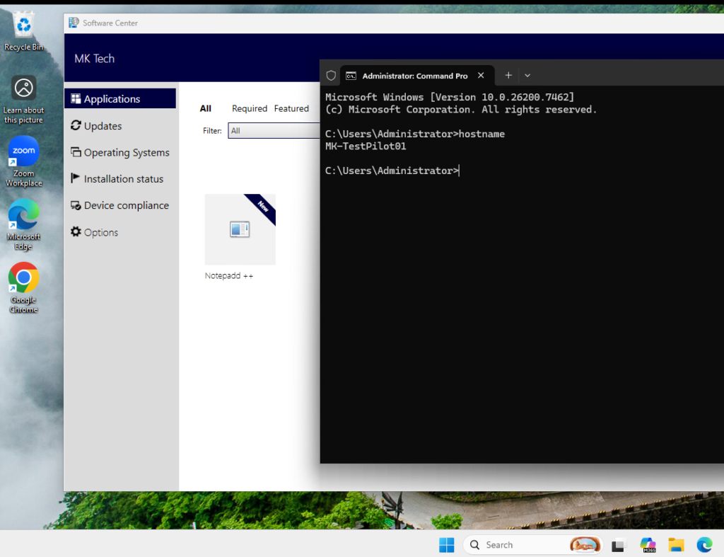 On the WINDOWS11 device, which belongs to the excluded OU, the Zoom Workplace application was not installed. The requirement rule successfully prevented the deployment from reaching this device. Only the available applications (like Notepad++) appear in Software Center, and there’s no Zoom icon on the desktop. The required deployment was filtered out before it ever reached this device.