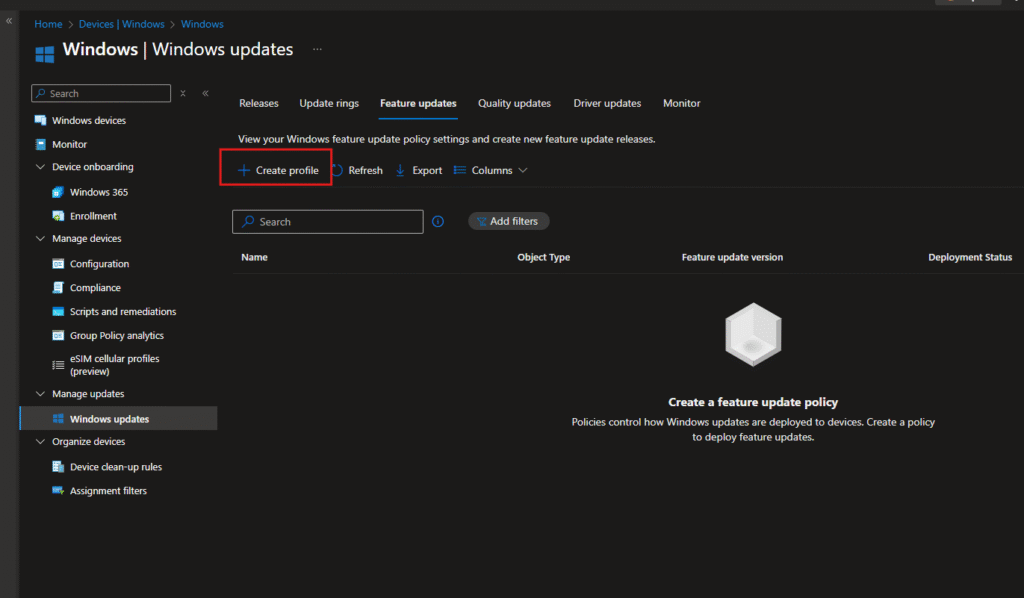 Log into the Intune admin center and go to Devices > Windows > Windows updates > Feature updates. This is where you’ll see all your feature update deployments. Initially it’s empty, with a prompt to create your first policy.