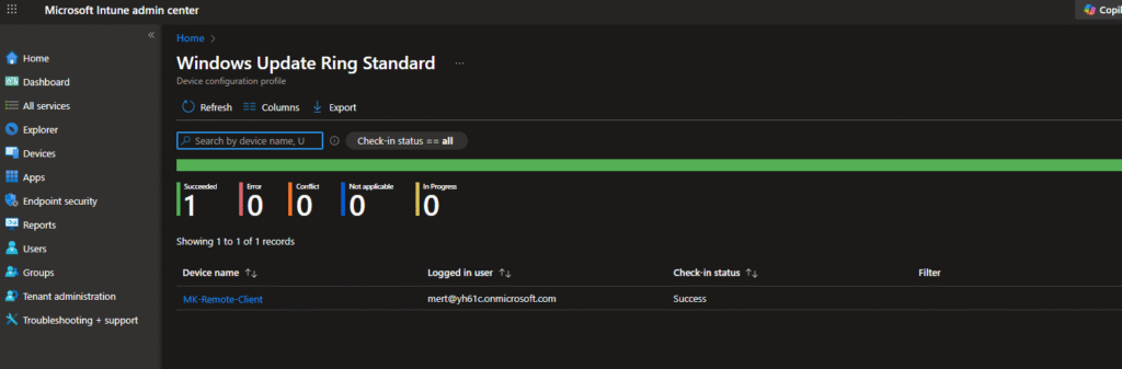 - Assigned group: Windows 11 Migration Pilot (1 device)