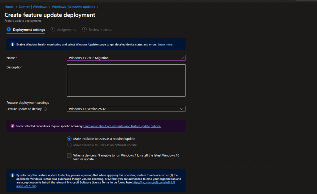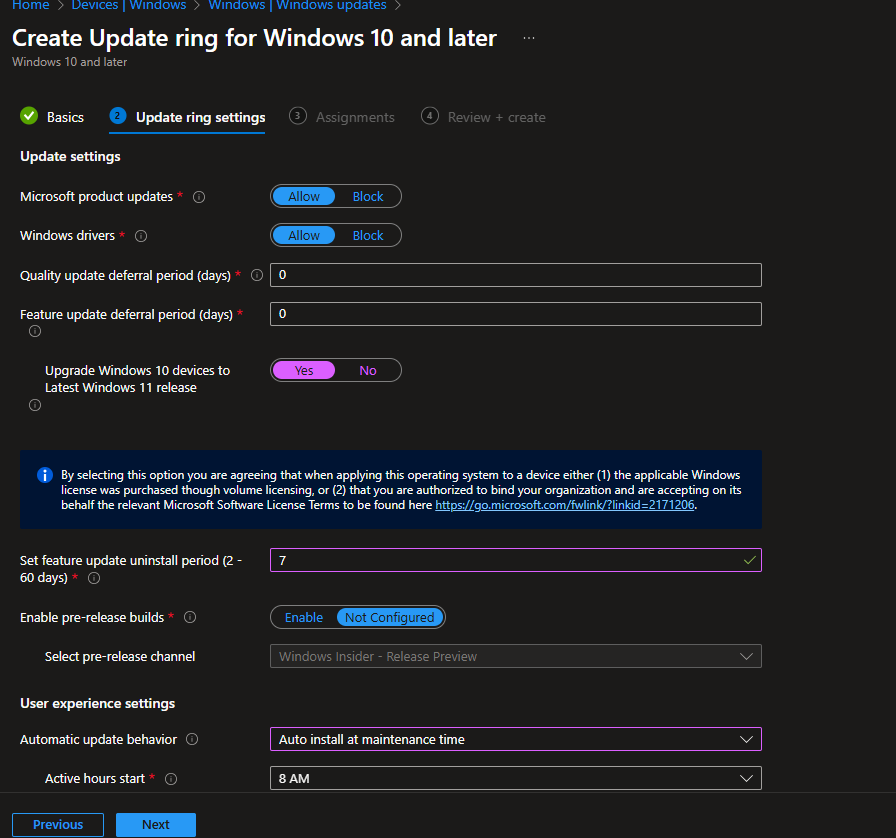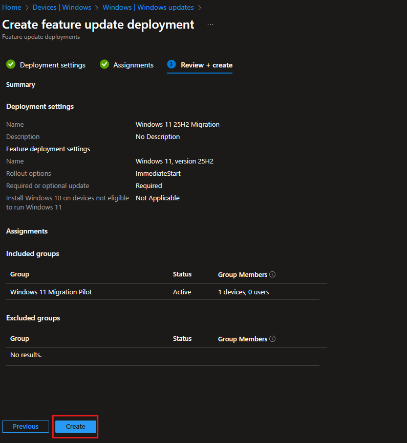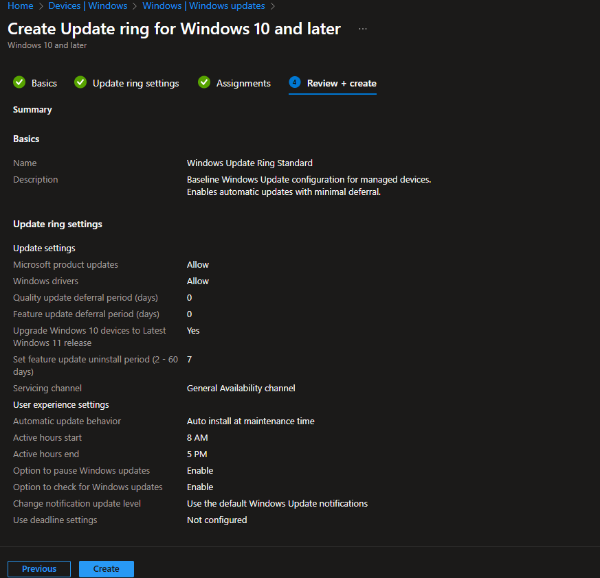 Important: Both policies need to target the same devices. The feature update policy delivers Windows 11, and the update ring controls how it’s installed.