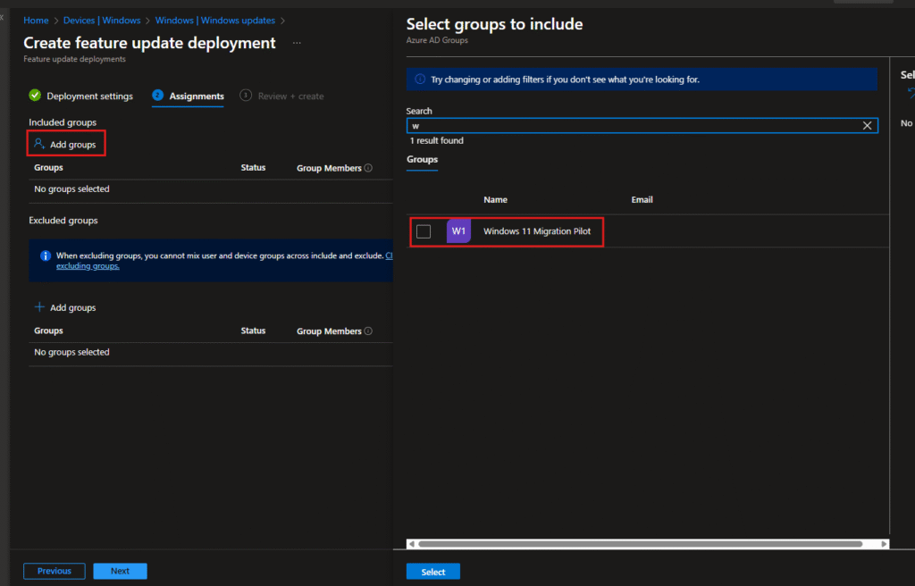 This is where you define who gets the update. I clicked Add groups and searched for my pilot group.