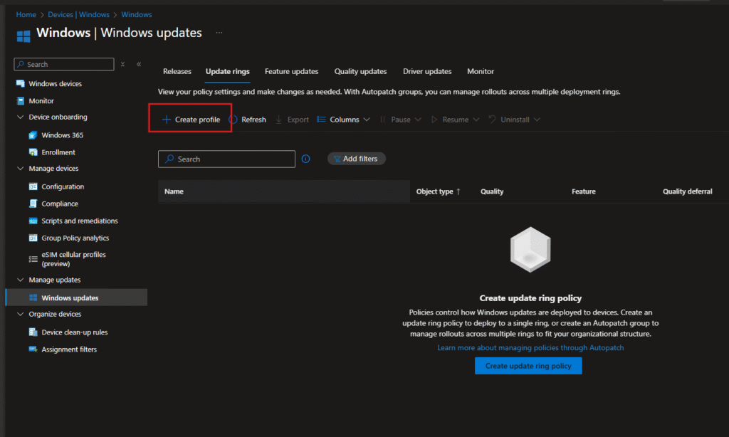 Go back to Devices > Windows > Windows updates and switch to the Update rings tab.