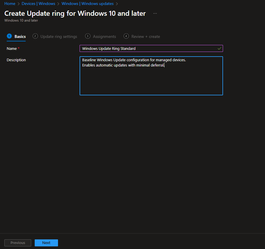 Now we need an Update Ring. While the feature update policy controls “what” gets deployed, the update ring controls “how” and “when”.