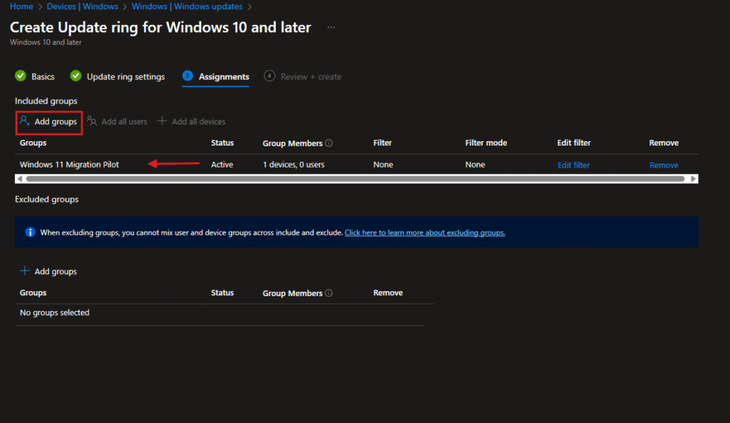 Just like with the feature update policy, I assigned this to the same “Windows 11 Migration Pilot” group.
