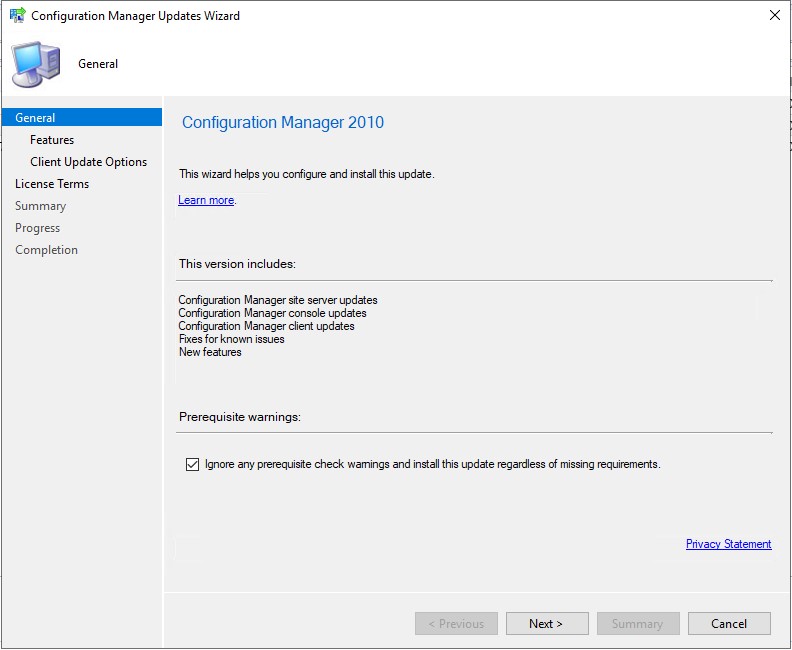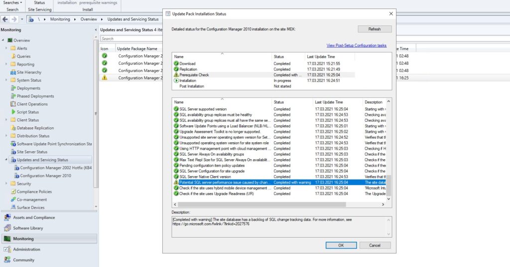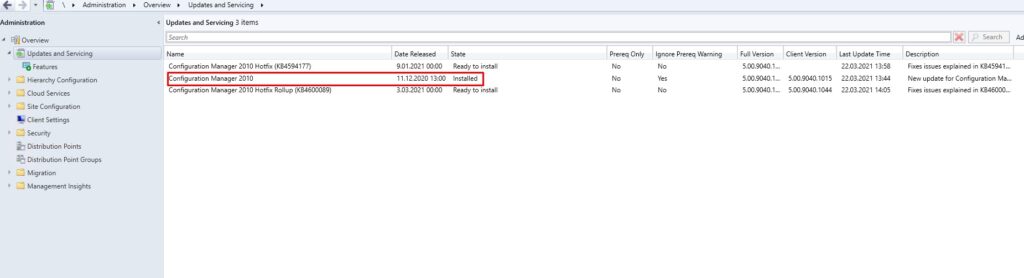 Konsol seçeneklerinden hızlıca bahsettikten sonra son adım olan Administration sekmesinden yapılan versiyon güncelleme işlemine geçiyoruz. Başlangıçta MECM’in 2002 versiyonu ile kurulumu gerçekleştirmiştim. Şimdi bu sürümü en son çıkan 2010 versiyonuna yükselteceğiz. Updates and Servicing seçeneğine gidiyoruz. Bu ekranda CM versiyonları ve Hot Fix paketleri gözükmekte. 2002 sonrasında çıkan 2006 verisyonuna geçmeden direkt olarak 2010 yükseltmesini yapabiliriz. İşleme yükleme öncesi ön koşulları kontrol etmeyle başlıyoruz.