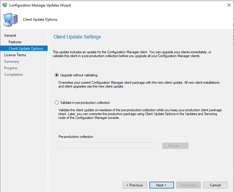 Burada Configuration Manager client paketleri ile ilgili iki seçeneğimiz bulunuyor. İlki direkt olarak eski CM paketlerinin üzerine yenisini yazarak yüklemeyi tamamlıyor. İkinci seçenekte bu yeni paketi direkt mevcut paketin üzerine yazmadan belirleyeceğiniz bir collection üzerinde test etmenize olanak veriyor. Sonrasında bu yeni paketin yüklemesini yapabiliyorsunuz.