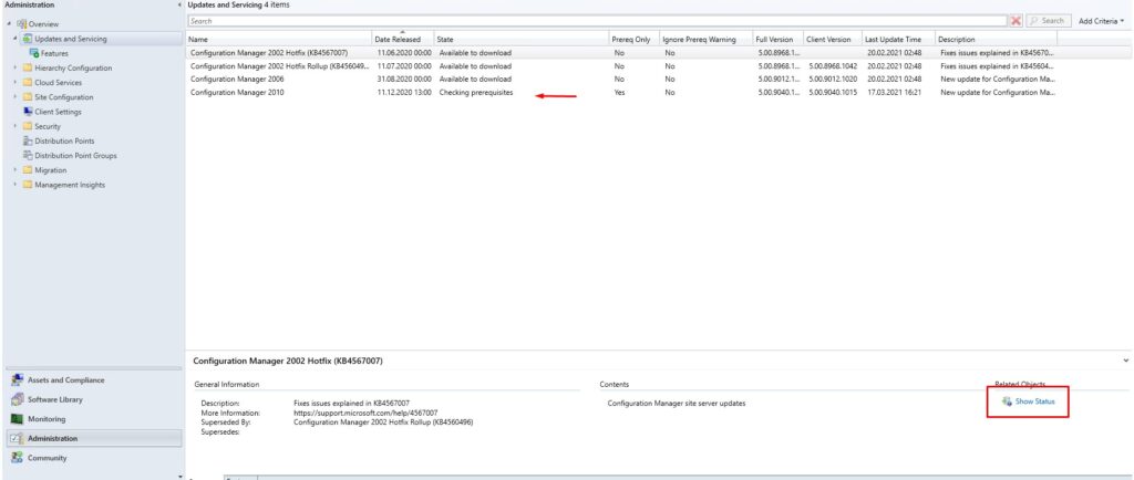 Bu kısayol bizi Monitoring sekmesinde bulunan Updates and Servicing Status bölümüne yönlendiriyor. Burada daha önceden yüklenen yada yüklenmekte olan güncellemelerimizi izleyebiliyoruz. CM 2010 üzerinde sağ tıklayıp tekrar “Show Status” diyoruz.