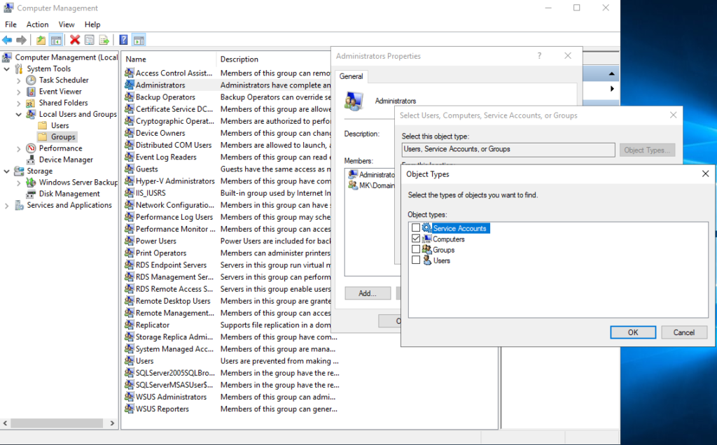 AD üzerindeki yetkilendirme işleminden sonra MECM sunucumuza dönüyoruz ve sunucun bilgisayar hesabını local administrator grubunun üyesi yapıyoruz.