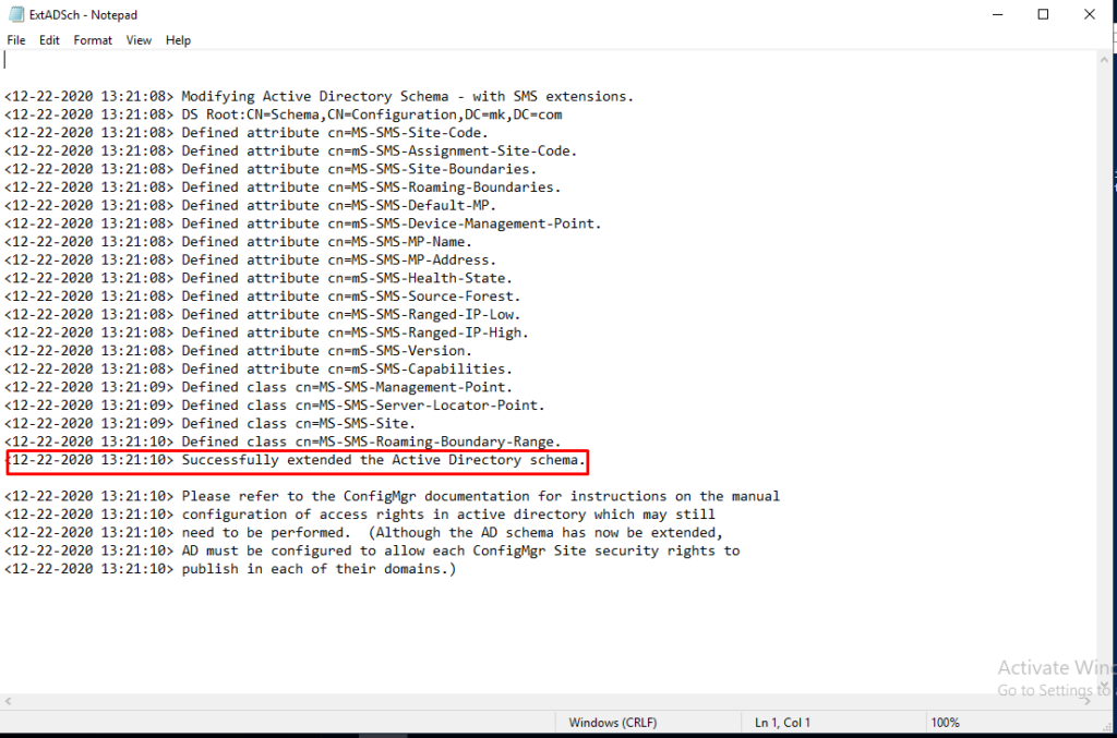 ExtADSch kısa bir özet bilgi bize vermekte detaylı olarak yapılan işlemleri incelemek isterseniz SMSSETUP -> BIN -> X64 yolunun altında “ ConfigMgr_ad_schema.ldf” adında bir log dosyası oluşmakta , bu dosyayı notepad ile açıp inceleyebilirsiniz.