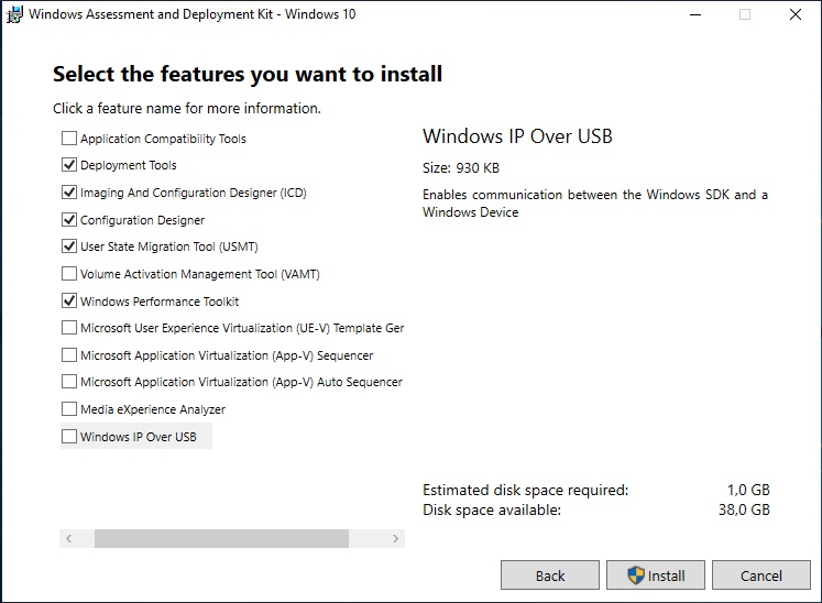 Bu adımda varsayılan olarak gelen özelliklerini görüntülüyoruz. İhtiyaca bağlı olarak bunlara ekleme ve çıkarma yapabiliriz. Burada USMDT ve Deployment Tools dışında ihtiyacımız olan bir özellik yok isteğe bağlı olarak sadece bu ikisinide yükleyebilirsiniz yada kullanmak istediğiniz özellikleride seçip devam edebilirsiniz. “Install” seçeneği ile yüklemeyi başlatıyoruz.