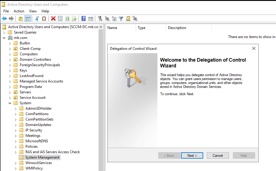 System management adıyla oluşturduğumuz bu container MECM sunucumuzun AD üzerindeki verilere erişimesini ve işlem yapabilmesini sağlayacak. Tabi gerekli izinlerin tanımlanması gerekiyor.