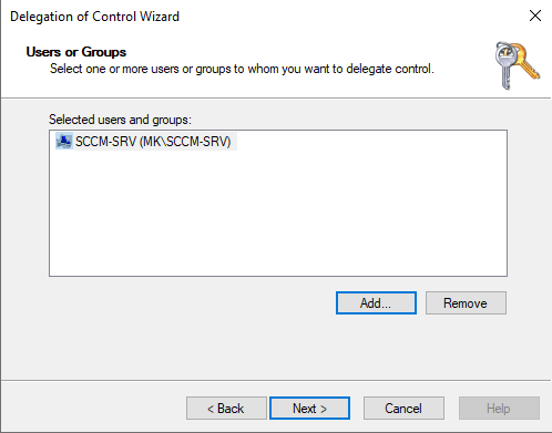 Bir sonraki ekranda yetkilendirme yapmak istediğimiz kullanıcı yada grupları seçmemizi istiyor. Burada MECM sunucumuzun bilgisayar hesabını ekleyip devam ediyoruz.