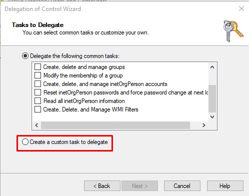 Bu adımda seçtiğimiz kullanıcıya varsayılan olarak oluşturulmuş yetkileri verebilir yada kendimiz bir yetkilendirme şekli tanımlayabiliriz. ‘’Create a custom task to delegate” ile devam ediyoruz.