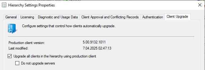 In the Hierarchy Settings, verify that the option “Upgrade all clients in the hierarchy when a new client update is available” is enabled.When this setting is active, client agents are automatically upgraded with each new version rollout.