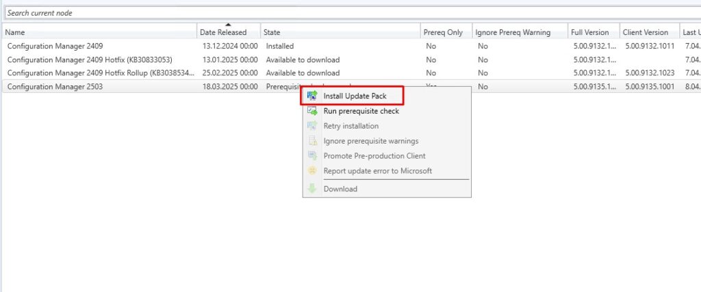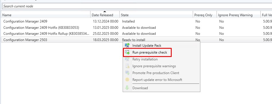 Before starting the upgrade process, it’s important to verify that your Configuration Manager environment is ready for the new version.To do this, right-click on the 2503 update in the console and select “Run prerequisite check.”This will initiate a full validation to ensure all required conditions are met before proceeding with the installation.