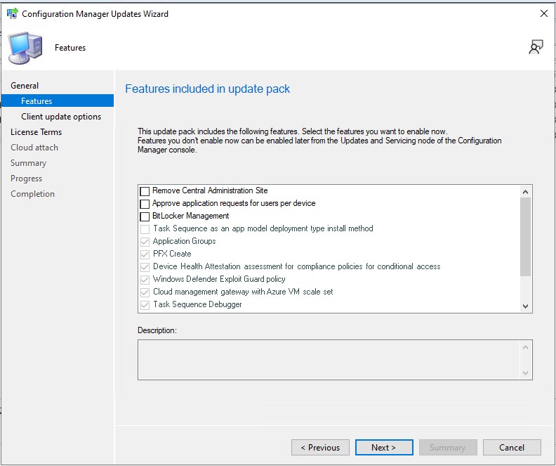 Here, you can choose to enable any new features you’d like to activate during the upgrade.These can also be enabled later via Administration > Overview > Updates and Servicing > Features.
