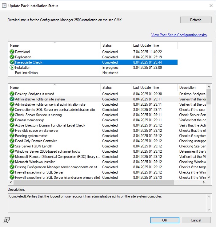 You can monitor the prerequisite check progress by navigating to Monitoring > Overview > Updates and Servicing Status, then right-clicking on Configuration Manager 2503 and selecting “Show Status.”