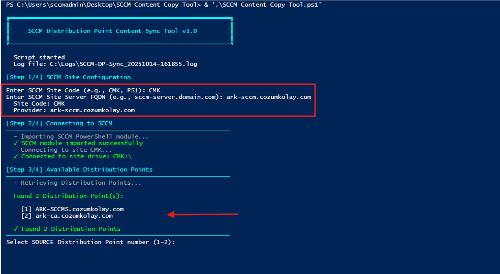 The script first asks for your Site Code and Site Server (for example, ABC and SCCMServer.domain.local). Once entered, it connects to your site and lists all available Distribution Points.
