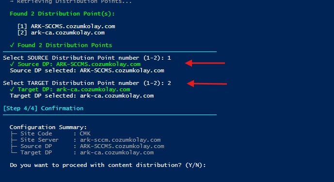After discovering all DPs, the script displays them in a numbered list. You just pick the Source (existing DP) and Target (new DP), then confirm when prompted. This extra confirmation step helps avoid sending content to the wrong DP by mistake.