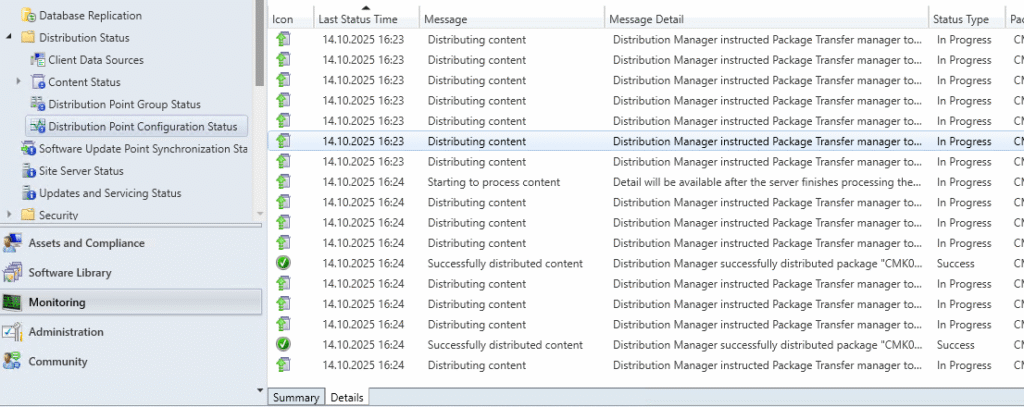 Finally, open the SCCM Console → Monitoring → Distribution Point Configuration Status. You should see your target DP receiving the packages and updates. That’s the confirmation everything worked as expected.
