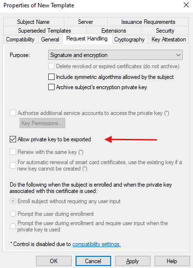 - Request Handling: Make sure “Allow private key to be exported” is checked.