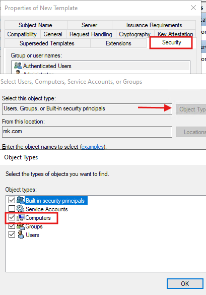 - Under the Security tab, click Add and search for Computers.