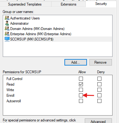 - Grant the WSUS server Enroll permission.