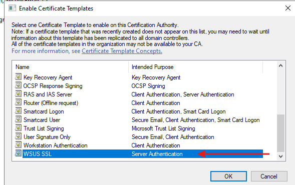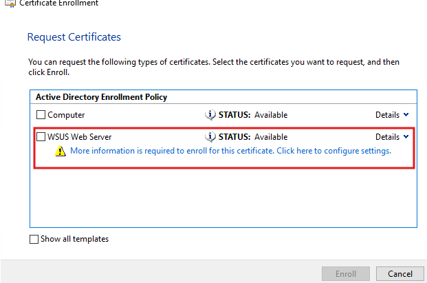 - In the Enrollment wizard, you should now see the WSUS Web Server certificate we created earlier.