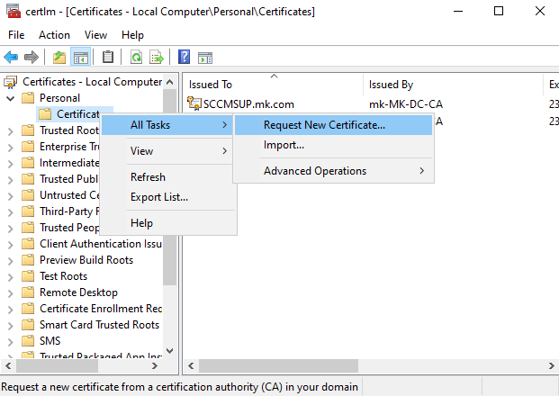 - Right-click and select All Tasks → Request New Certificate.