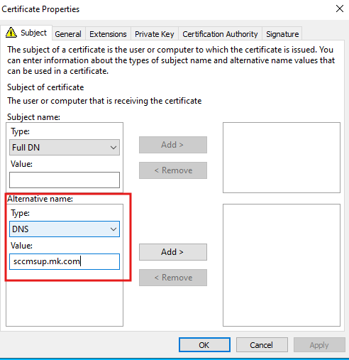 - Under the Subject tab, select Alternative Name → DNS.