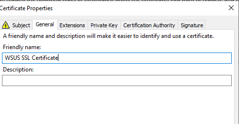 - Under the General tab, provide a Friendly Name for easier identification (e.g., WSUS SSL Certificate).