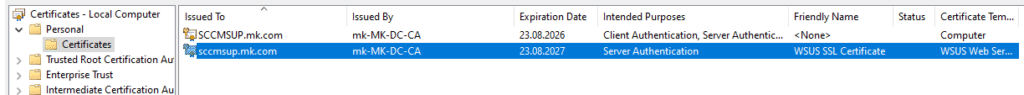 - Once complete, you should see the new WSUS SSL certificate listed in the Local Computer store.