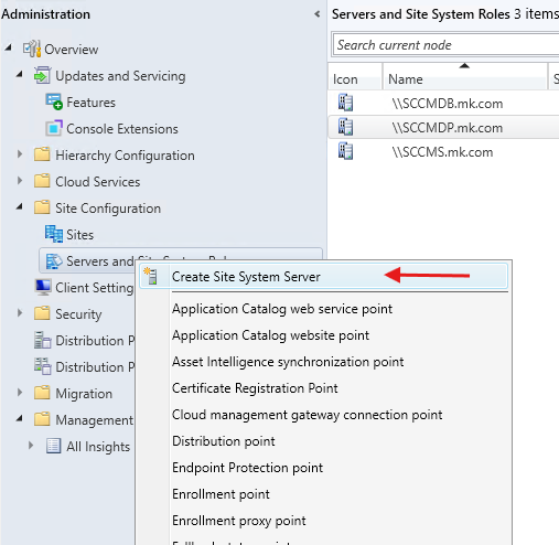 - Right-click and select Create Site System Server.