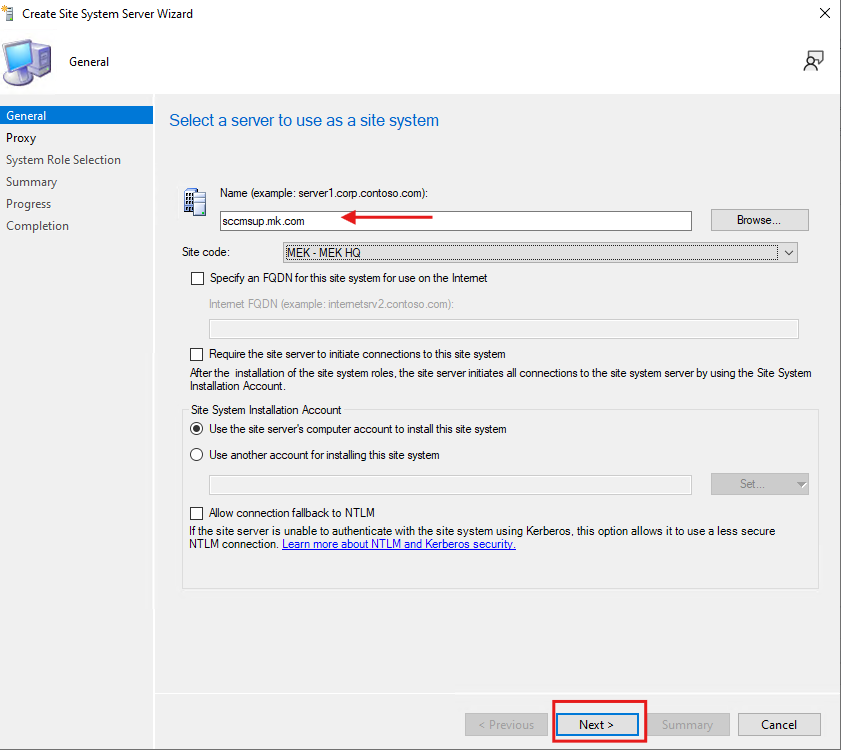 - In the Specify a site system server window, enter or select your WSUS server.