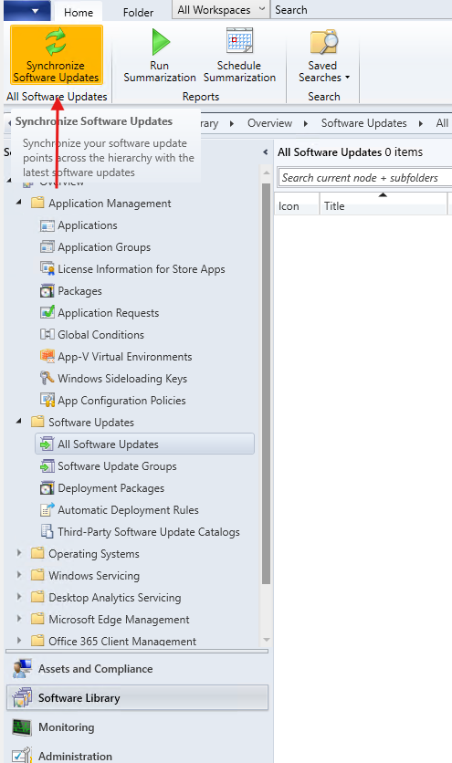 - Once configuration is complete, go to the Software Library → Software Updates node in the SCCM console.