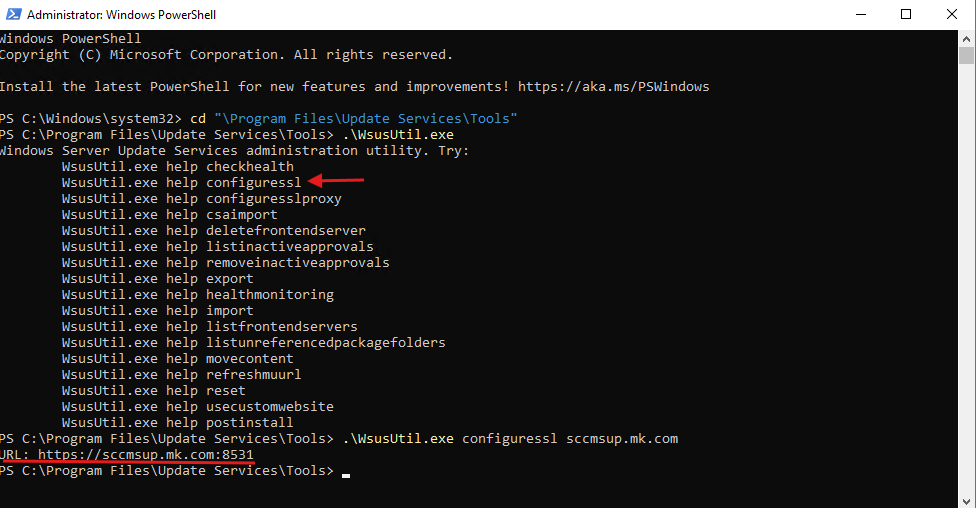 wsusutil.exe configuressl wsus.domain.com (Replace wsus.domain.com with your WSUS server FQDN) - If successful, the WSUS URL should now be updated to use HTTPS.